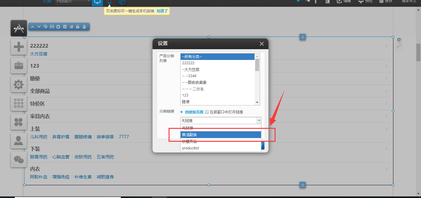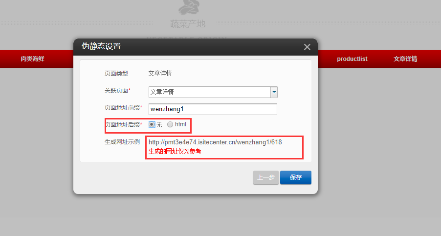 1.以PC版为例,首先在建站编辑器中点击“设置”-“伪静态”-“添加伪静态规则”,选择页面的类型“产品列表”或“文章列表”,进行伪静态的设置,设置完成后点击“保存”,然后在编辑器中拖入“文章分类”或“产品分类”,点击“设置”,将分类链接页面与在伪静态设置中的页面选择一致即可,然后点击保存,如图所示: