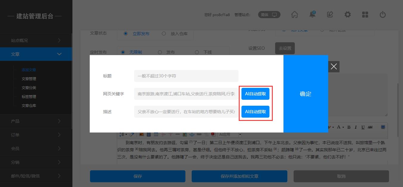 后台:添加文章—SEO设置—AI自动提取